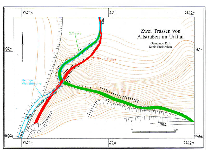 The western route, which bypassed this point, headed more or less straight down into the valley after the fork. It followed the narrow ridge of the promontory that rises at the distinctive bend of the Urft River. This section, with a gradient of only 13 percent, was considerably flatter. After both routes had crossed the Urft in the valley – presumably via a ford – they rejoined. From there, the Agrippa Road climbed the southern slope and continued across the plateau towards Marmagen.
