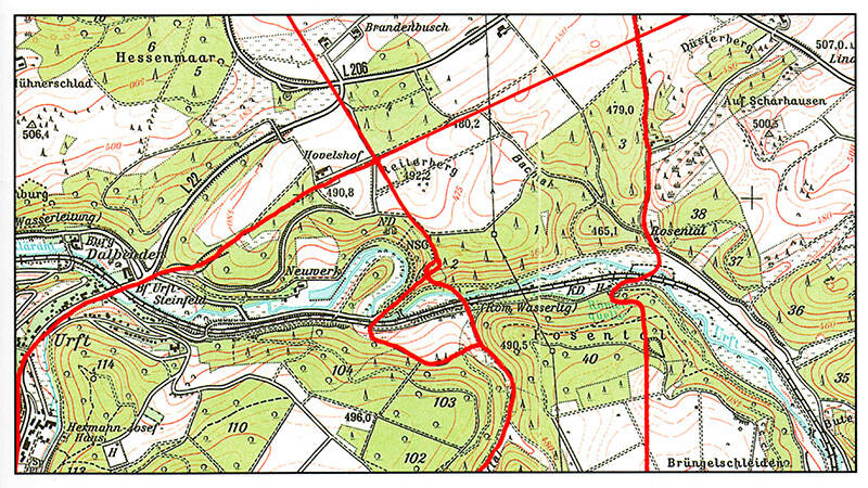 - First photo: the “spaghetti knot”: Two paths with different gradients lead to the Urft valley. Illustration: U. Ullrich-Wick, LVR Office for Monument Preservation in the Rhineland