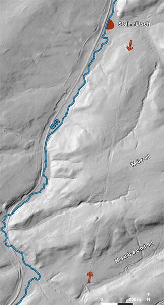- Second photo: laser scan of the Mürel: the route of the Via Agrippa is clearly visible in the forest floor. Illustration: K. Lang-Novikov, LVR Office for Monument Preservation in the Rhineland. Geobase data of the municipalities and the state of NRW: © Geobasis NRW