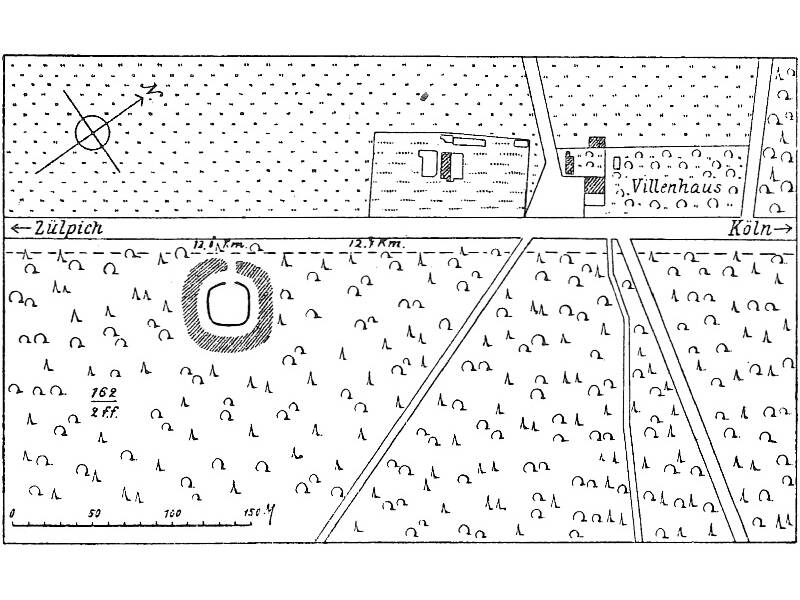 Directly adjacent to Agrippastraße, near the former villa (a former forester’s lodge), stood a Roman fortification, a so-called burgus. This Roman road post fell victim to lignite mining in the 1920s. However, it had previously been examined by the then Provincial Museum in Bonn.