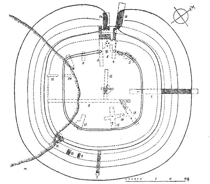 - Second photo: the Roman burgus at Villenhaus, excavation plan from 1923. Source: H. Lehner, Bericht über die Tätigkeit des Provinzialmuseums in Bonn. Bonner Jahrbücher 129, 1924, pg. 257