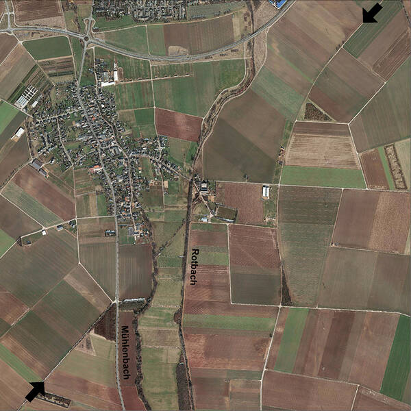 South of Ahrem, the Agrippa Road crosses the Rotbach stream, formerly known as the Bleibach, for the first time. The Rotbach is heavily regulated at this point. To the west runs the Lechenich millrace, the former Rotbach. The course of the Roman road is visible from the air in the surrounding fields; east of the Rotbach, it is marked in the fields as an embankment. A ditch now runs between the two waterways, precisely following the route of the Roman road.