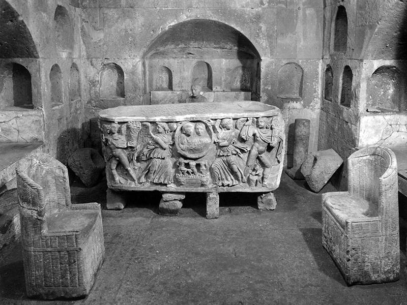 De grafkamer uit de 2e eeuw na Christus is luxueus ingericht als eetkamer. Alsof ze gemaakt zijn voor de eeuwigheid staan er banken en fauteuils van kostbaar marmer en kalksteen. De tombe werd generaties lang gebruikt door een rijke familie, tot de 4e eeuw na Christus. Het gaat waarschijnlijk om de eigenaars van een groot landgoed (villa rustica) in de buurt. Marmeren portretten beelden overleden familieleden af.