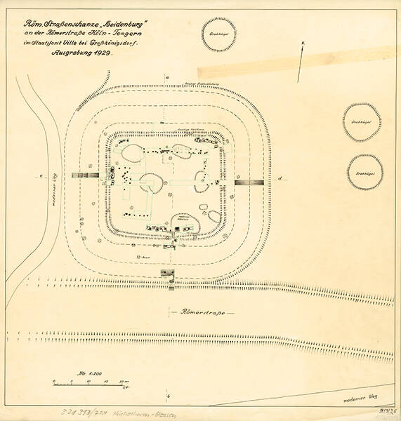 - Eerste foto: Militaire wegpost "Heidenburg": Plattegrond op basis van opgravingsvondsten. Bron afbeelding: LVR Bureau voor Archeologisch Erfgoedbeheer in het Rijnland.