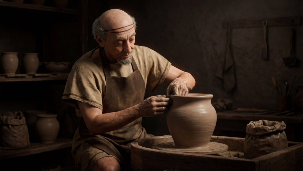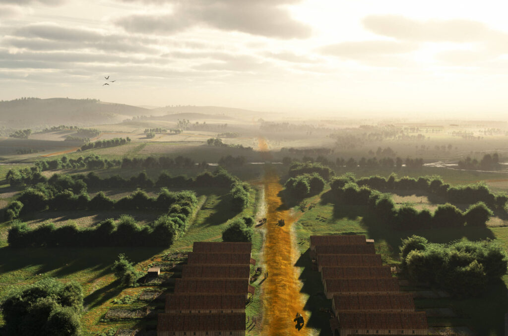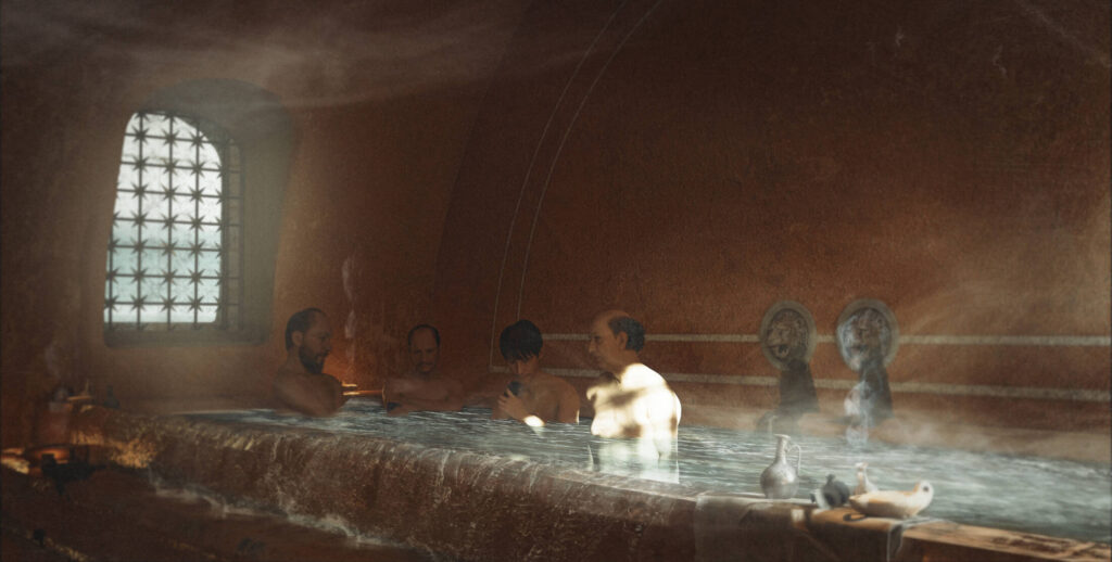 - reconstructie Heerlen daken en Via Belgica – Mikko Kriek; AI figuren en reconstructie badhuis – Submedia; foto Romeins badhuis – Het Romeins Museum; scène herberg – Chat Gpt; Kruik Maastricht – RMO