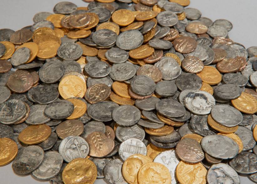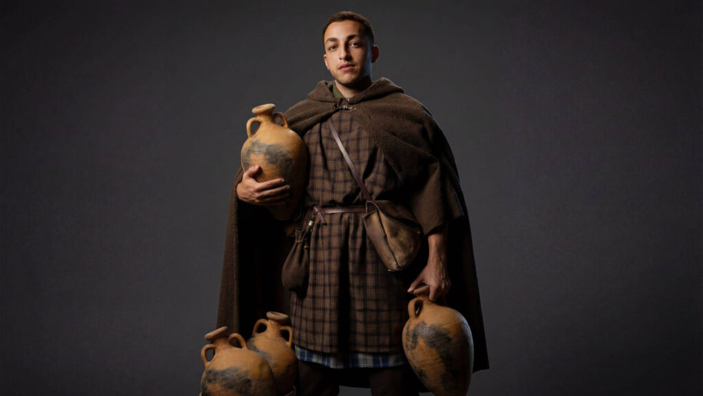 - drinkbeker met gezicht uit Heerlen – RMO; drinkbekertje – Jera; twee drinkbekers – archeologiedepot Utrecht; herberg – Chat GPT; AI figuren – Submedia; amforen – Museum de Bastei;l kruik en bekers – catalogus Coriovallum 1977; munten – TV midden-Holland
