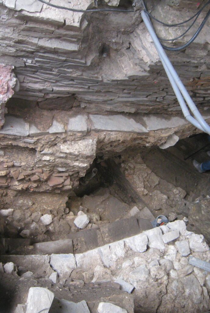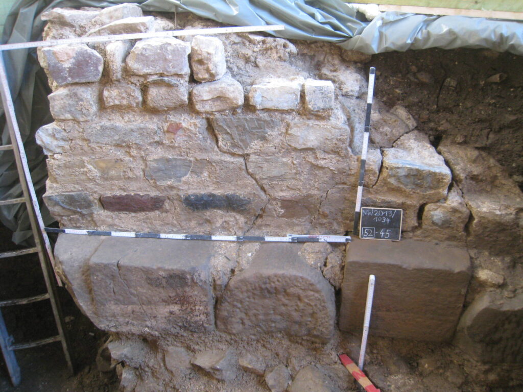 - Beide afbeeldingen in de slideshow laten de resten van de verdedingsmuur van het castellum zien waar Romeinse spolia in zijn gebruikt. De foto is gemaakt door Stadtarchäologie Aken.