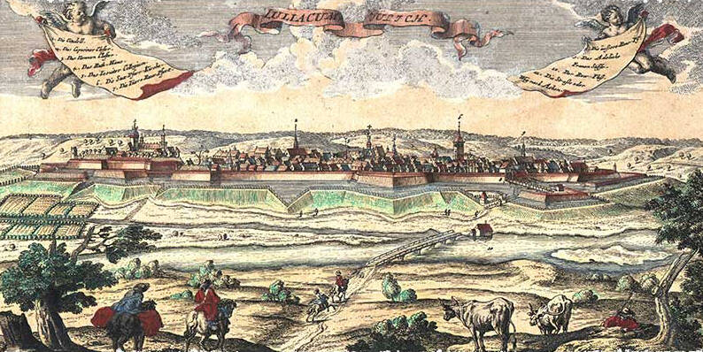 Tweede foto: Jülich, afgebeeld door Johann Christian Leopold in een kopergravure naar een tekening van Friedrich Bernhard Werner, 1736. Bron afbeelding: Stadsarchief van Jülich