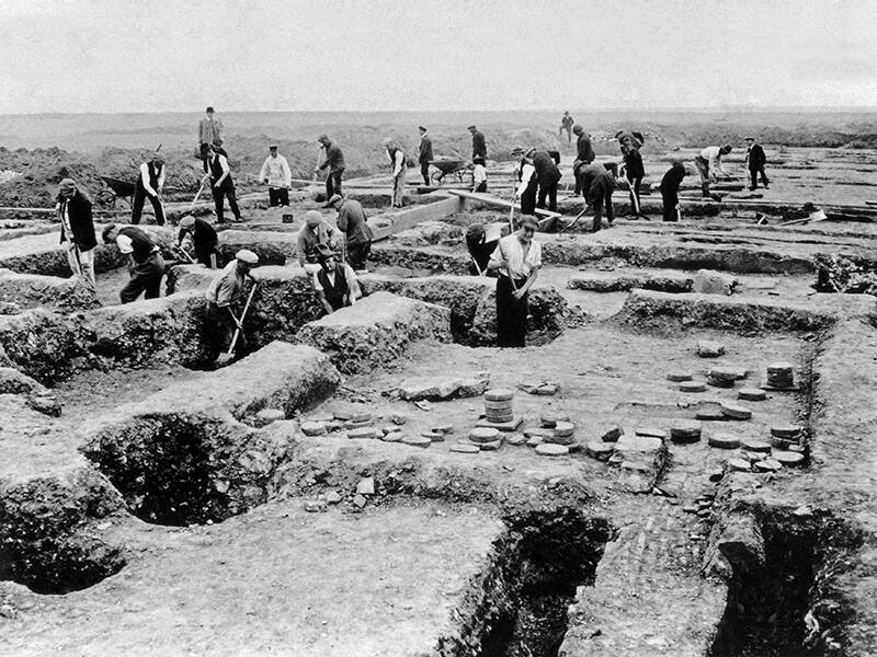Eerste foto: Müngersdorf, Romeins landgoed, 1926. Opgraving van het landhuis. Aanleg van de vloerverwarming in de badvleugel aan de noordzijde van het huis. Foto: Romeins-Germaans Museum van de stad Keulen