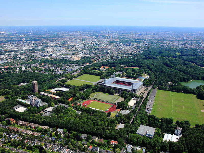 Het RheinEnergieStadion in Müngersdorf – de thuisarena van de “1. FC Köln”, dé voetbalclub van Keulen – en de Duitse Sportuniversiteit domineren het enorme sportterrein aan beide kanten van de Aachener Straße. Dit gebied werd in de jaren 1920 onder burgemeester Konrad Adenauer gecreëerd als onderdeel van de “Äußere Grüngürtel”, de buitenste groene gordel rond de stad. Fort V van de Pruisische vestinggordel (1870/90) dat hier ligt, was tijdens de nazitijd een verzamelplek voor Joden uit Keulen en Aken. Fort V werd in 1962 gesloopt.