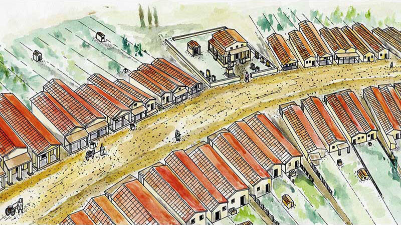 - Eerste foto: de smalle strookwoningen zijn typische gebouwen van een Romeinse nederzetting langs de weg (vicus) zoals Jülich (Iuliacum). Grafisch ontwerp: M. Perse, tekening: M. Najdul