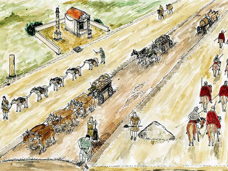 - Tweede foto: landschap van de Romeinse weg Via Belgica buiten de nederzettingen. Grafisch ontwerp: M. Perse, tekening: M. Najdul