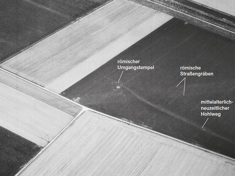 - Eerste foto: een luchtfoto uit 1953 toont een heiligdom langs de Via Belgica. Foto: G. Amtmann, LVR Bureau voor Archeologisch Erfgoedbeheer