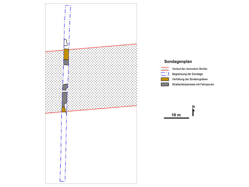 De weg, die aan beide kanten werd geflankeerd door greppels, was bijna 25 meter breed van middengreppel tot middengreppel. De breedte van de eigenlijke, met grind bedekte weg varieert van iets minder dan vijf meter toen de weg werd aangelegd aan het begin van de 1e eeuw tot zeven meter in de laatste uitbreidingsfase. De greppels werden gebruikt voor afwatering, maar markeerden ook de grens van het wegengebied dat in handen was van de staat. Tussen de hoofdweg en de greppels lagen onverharde zandpaden, de zogenaamde zomerpaden. De archeologische opgravingen die ter plekke werden uitgevoerd, onthulden duidelijk de greppels van de weg en de sporen van Romeinse karren die in de grond zijn uitgesleten.