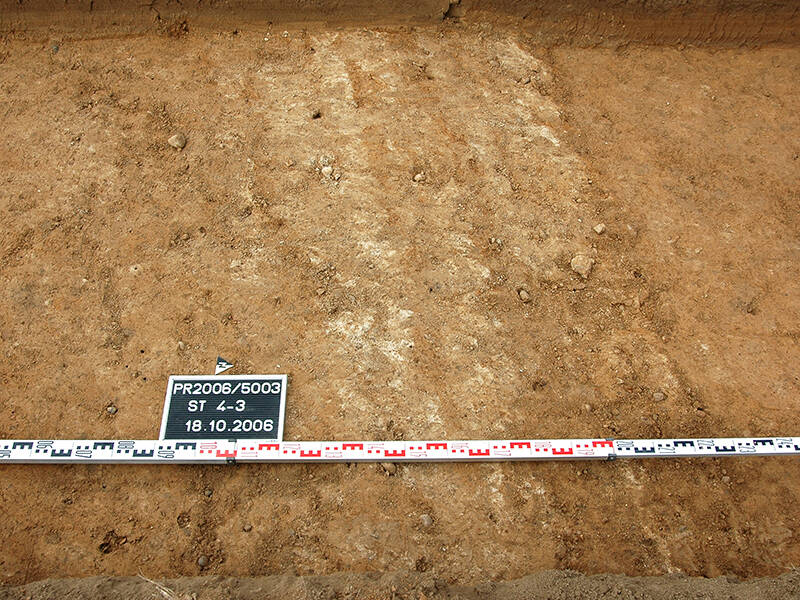 - Tweede foto: wielsporen van Romeinse strijdwagens in de Via Belgica. Foto: R. Dortangs, LVR Bureau voor Archeologisch Erfgoedbeheer in het Rijnland