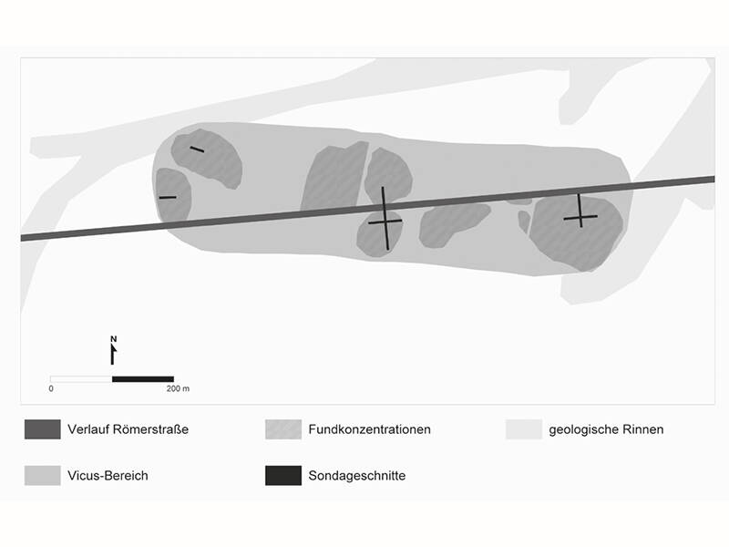 - Eerste foto: schematische plattegrond van de vicus van Baesweiler. Grafiek: M. Mertens, LVR Bureau voor Archeologisch Erfgoedbeheer in het Rijnland.