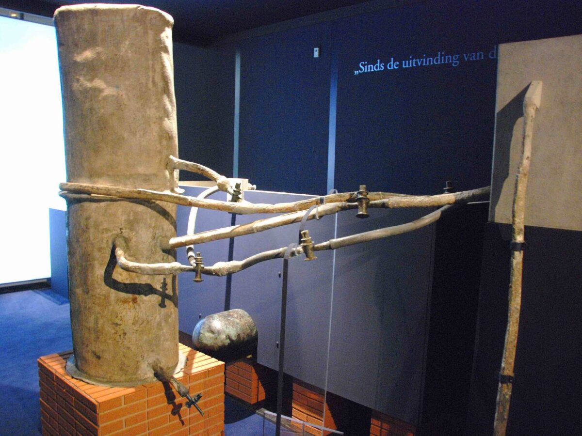 Foto: Boscoreale (Italië) rechts loden verdeel bakje, links de loden warmwaterketel en ertussen verbindende leidingen met kranen (foto Museum het Valkhof, Nijmegen 2008.)